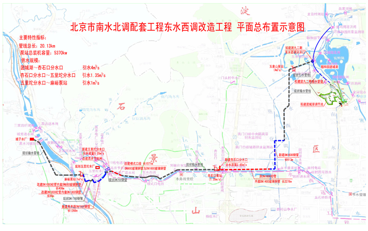 东水西调改造工程是充分利用现状供水设施进行改造,实现密云水库和南水北调来水切换以及向北京西部地区扩建的门头沟城子水厂和石景山规划水厂提供南水北调水源的关键性工程。工程起点位于北京市颐和园团城湖,沿线穿越海淀、石景山和门头沟地区 , 至门头沟城子水厂 , 全长约 21.4 公里。